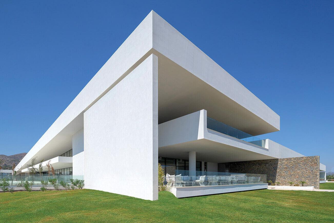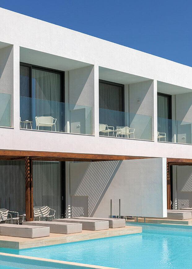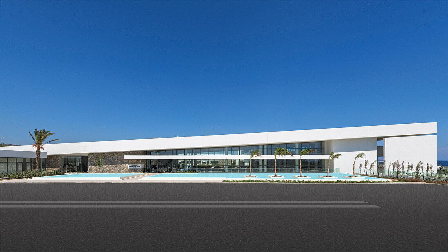 The residential unit is characterized by the dynamic movement flow from public to private. From a planted courtyard and a semi-outdoor space to the bedroom area, and finally reaching a private swimming pool. A network of main, secondary, and private pools twists around the two-story accommodation units, which are set as neighborhoods, redefining the scale of contemporary hotel settlements in relation to the environment and the visitor. The purpose of the installation was to take advantage of the attractive local conditions, offering a particular microclimate through the use of continuous plantings and the intense presence of the water element.